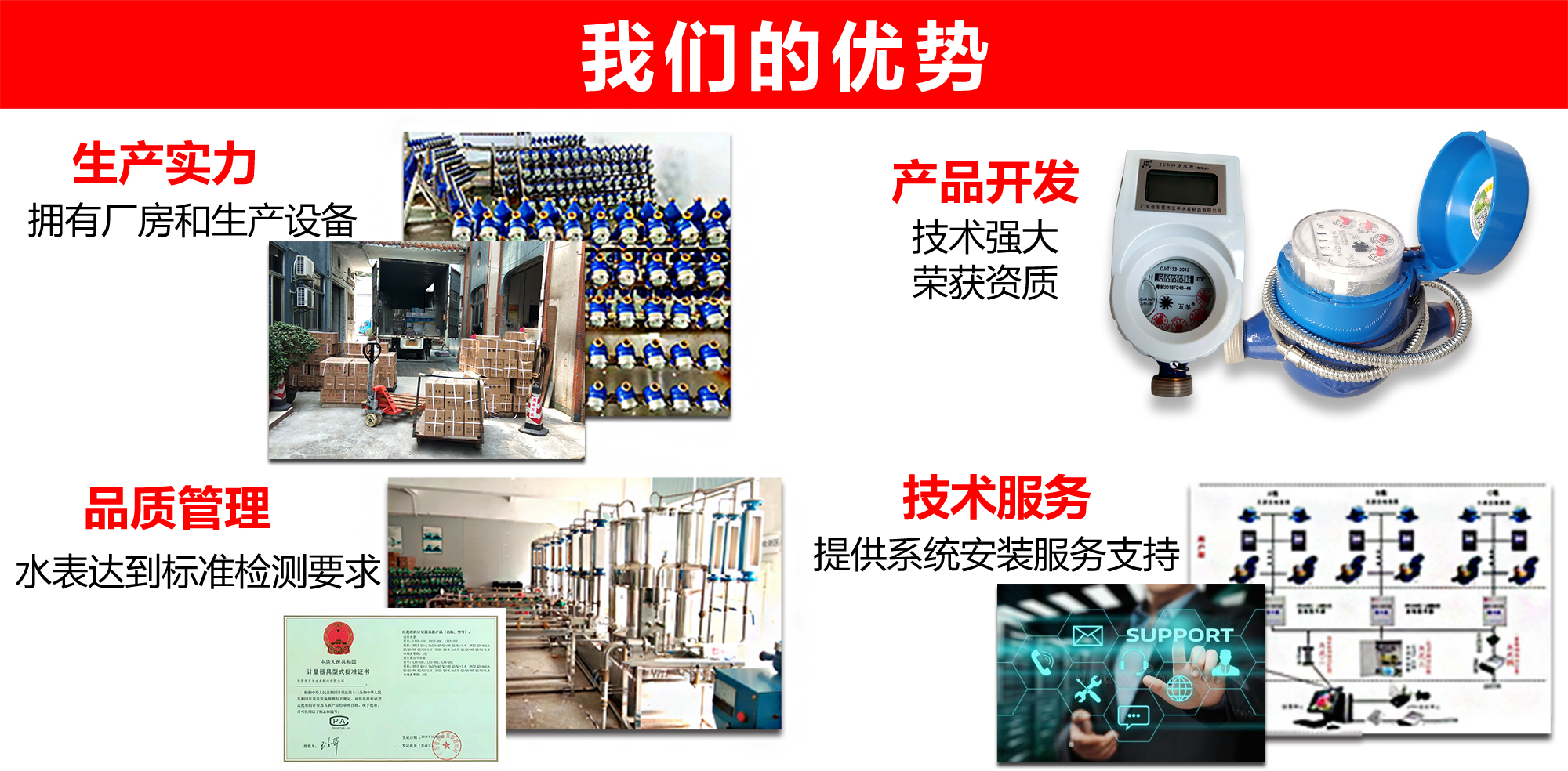 本公司是一家擁有456.jpg商標、廣東省一家擁有五羊水表合法資質的水表廠家。通過ISO- 2016認證,擁有多項自主品牌的知識產權,對智能卡表和光電直讀遠傳表提供多種技術解決方案。